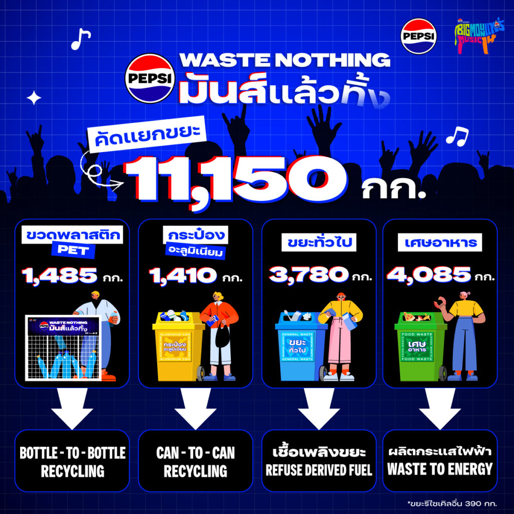 นายอชิต โจชิ ประธานเจ้าหน้าที่บริหาร บริษัท ซันโทรี่ เป๊ปซี่โค เบเวอเรจ (ประเทศไทย) จำกัด กล่าวว่า “เรารู้สึกภูมิใจที่แคมเปญ ‘Waste Nothing – มันส์ แล้ว ทิ้ง’ ในปีนี้ประสบความสำเร็จเป็นอย่างยิ่ง และได้รับเสียงตอบรับที่ดีมากจากผู้เข้าร่วมงาน โดยสามารถคัดแยกขยะได้สูงถึง 11,150 กิโลกรัม เพิ่มขึ้นจากปีที่แล้วกว่าเท่าตัว เราหวังว่าแคมเปญนี้จะเป็นโมเดลต้นแบบที่ดี ที่กระตุ้นให้ทุกภาคส่วน ทั้งภาครัฐ ภาคเอกชน และภาคประชาสังคม ตระหนักถึงความสำคัญของการคัดแยกขยะอย่างถูกวิธีตั้งแต่ต้นทาง เพื่อช่วยลดปริมาณขยะสู่หลุมฝังกลบ ซันโทรี่ เป๊ปซี่โค ประเทศไทย ในฐานะผู้ผลิตและจัดจำหน่ายเครื่องดื่ม มุ่งส่งเสริมการคัดแยกและเก็บกลับขวดพลาสติก PET ใช้แล้วอย่างจริงจังและต่อเนื่องเพื่อรีไซเคิลหมุนเวียนกลับมาเป็นขวดใหม่ หรือที่เรียกว่า “Bottle-to-Bottle Recycling” โดยขวดพลาสติก PET ที่คัดแยกได้ภายในงานนี้ทั้งหมดจะถูกนำไปรีไซเคิลเป็นขวด rPET 100% (ขวดจากพลาสติกรีไซเคิล 100%) ซึ่งนอกจากจะช่วยลดการใช้ทรัพยากรใหม่ ยังช่วยลดการปล่อยก๊าซเรือนกระจก และช่วยส่งเสริมเศรษฐกิจหมุนเวียน ตอกย้ำการดำเนินธุรกิจควบคู่ไปกับการดูแลสังคมและสิ่งแวดล้อมตามค่านิยมองค์กร ‘การเติบโตอย่างยั่งยืน’ (Growing for Good) ของซันโทรี่ เป๊ปซี่โค ประเทศไทย”